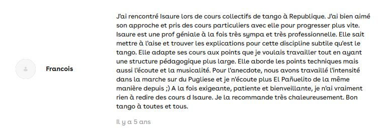 J'organise aussi des stages de tango et événements ponctuels : à suivre sur ma page Facebook Isaure Tango.